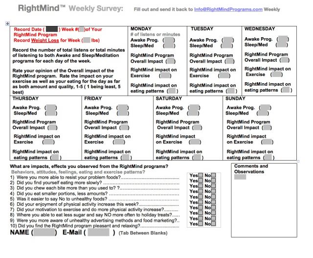 Log for tracking use of RIghtMind Weight Loss & Fitness Strengthening Programs. Logging of eating and food patterns as well as exercise has been shown to increase success. Any system you use to track daily patterns can be helpful, whether it is detailed or just general.